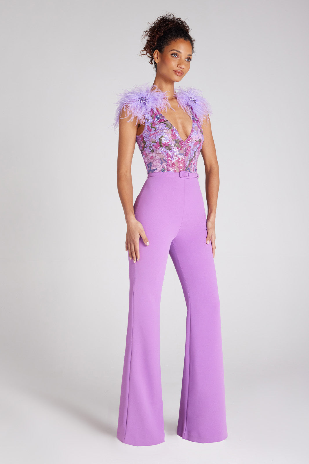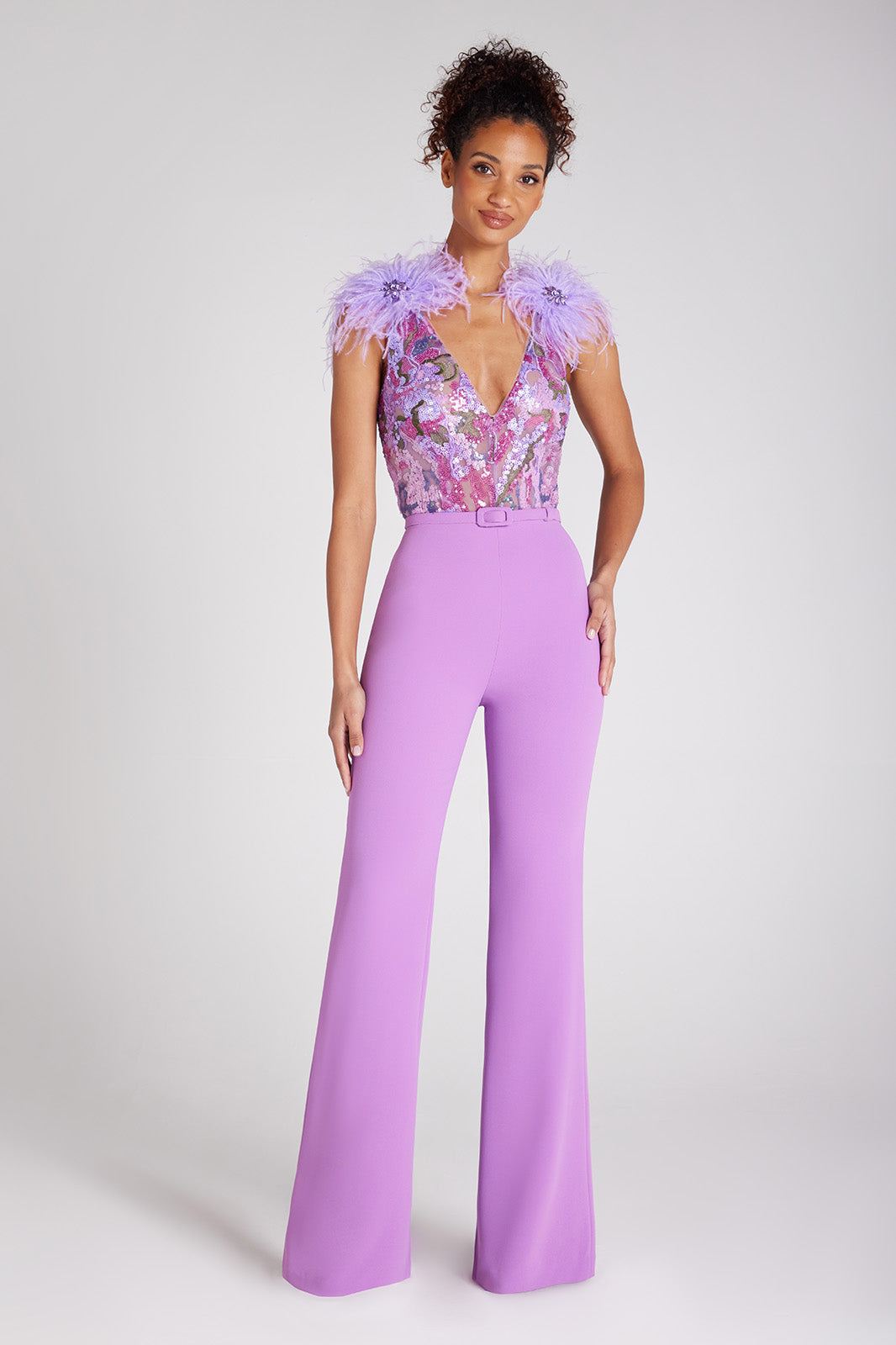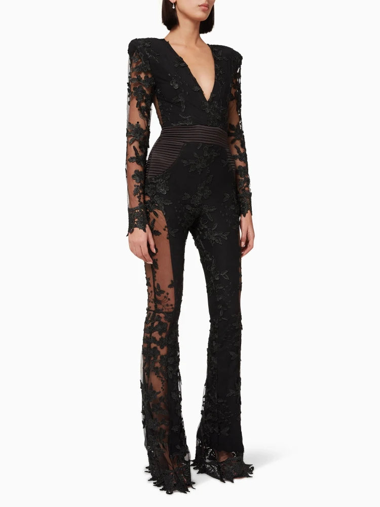 Ambrosia- lange Ärmel Blumen Diamanten Stickerei Jumpsuit.